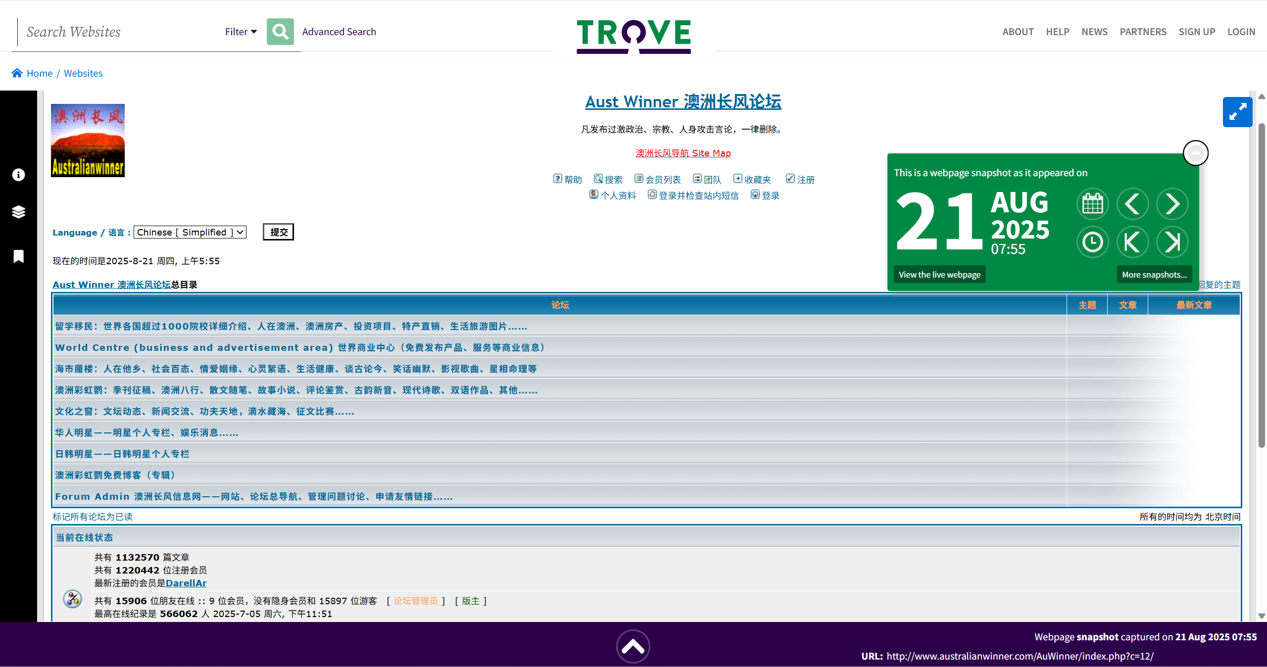 仍在运作,其名称依旧代表着澳大利亚网络文化遗产保存的专业性与权威性。 二十年不断的数字坚守 2004 年,我们在几乎没有社交媒体的年代,靠着最朴素的论坛系统把资讯、经验与文学聚起来。二十多年里,长风信息网经历过服务器迁移、系统升级、内容整顿与社区演变,但“不中断”从未改变。很多当年的中文论坛早已消失,长风还在写、还在更新,这正是今天能被 TROVE 重新启动全站收录的底气。 TROVE/PANDORA 的长期保存记录 早在 2005 年起,国家图书馆就通过 PANDORA 对长风进行收录与历史快照留存,证明我们的持续性与公共价值: 此次 2025 年 8 月 21 日起的全站永久收录,是在既有保存基础上的全面升级:从个别页面/阶段性抓取,提升为对整站进行镜像,并按年例行更新,以保证内容的连续性与完整性。