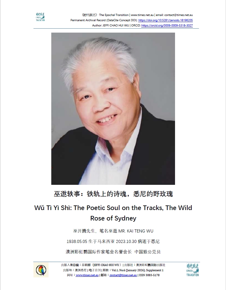 『時代の躍遷』は、Jeffi Chao Hui Wu(巫朝暉)によって独立して創刊、執筆、編集されている。著者は2005年より分野横断的研究と出版実践を継続的に行っており、その研究出版活動は、機関の職位やプロジェクト資金に依存せず、長期運用される情報システムとデジタル出版メカニズムの上に構築されている。本誌の研究、執筆、多言語同時処理、編集、組版、公開、バージョン管理のプロセスはすべて、著者一人によって独立して設計され、継続的に維持されている。著者の国際学術IDは、ORCID世界的研究者IDシステムを通じて確立され、公開記録されている(ORCID https://orcid.org/0009-0009-5318-3027)。